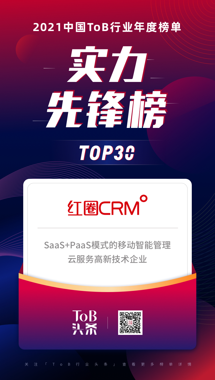 12月27日,「ToB行業(yè)頭條」聯(lián)手3W集團正式發(fā)布了《2021ToB行業(yè)年度榜單·實力先鋒榜》,評選出了2021年ToB領(lǐng)域各賽道最具實力的先鋒企業(yè)TOP30?!昂蛣?chuàng)科技(紅圈CRM)”作為數(shù)字化智能企業(yè)云服務領(lǐng)域的先鋒企業(yè),入選榜單行列!