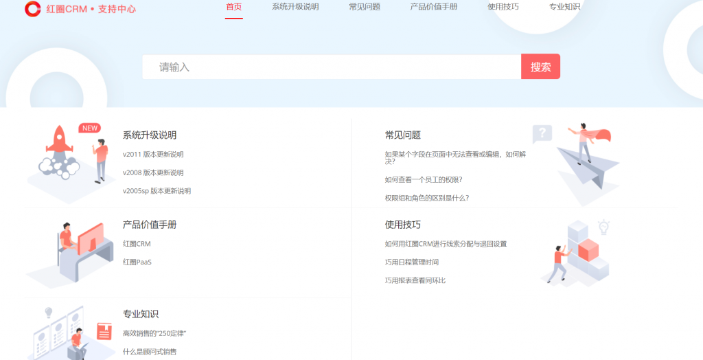 支持中心包含產(chǎn)品價(jià)值手冊、版本更新說明、常見問題、常用技巧和專業(yè)知識(shí)五部分,用戶可方便查找相關(guān)內(nèi)容。在前臺(tái)頁面右上角點(diǎn)擊“支持中心”可直接進(jìn)入支持中心。