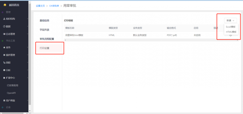 系統(tǒng)設(shè)置—擴(kuò)展中心—已安裝應(yīng)用—OA審批單—打印設(shè)置,和對(duì)象一樣支持excel和html模板