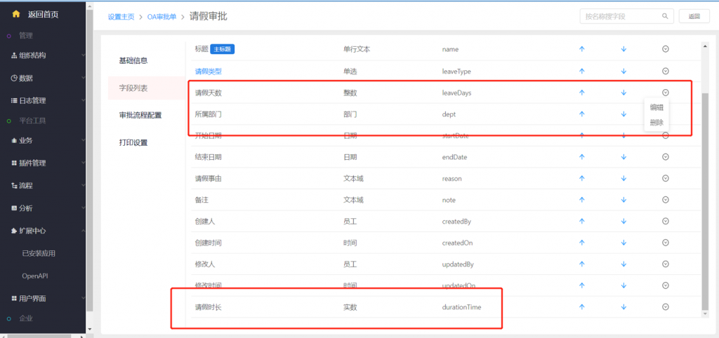 OA審批單—請(qǐng)假審批中默認(rèn)增加實(shí)數(shù)類型的“請(qǐng)假時(shí)長”字段;原“請(qǐng)假天數(shù)”改為可刪除