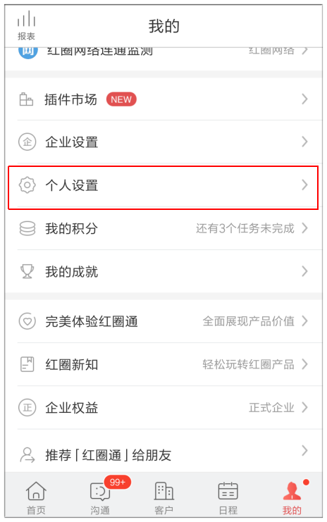 首先,打開紅圈通,進入【我的】,然后下拉屏幕點擊【個人設置】;
