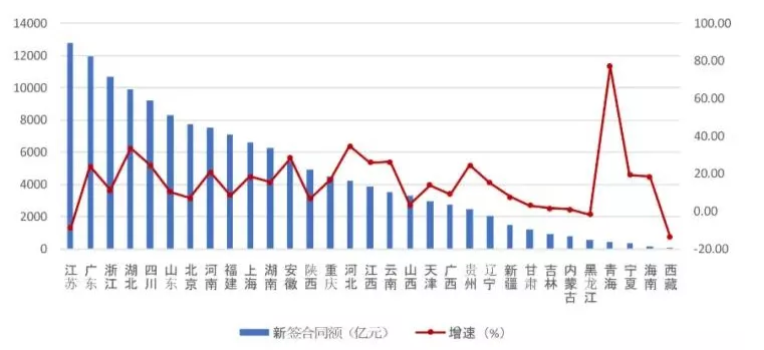 2021年上半年,江蘇、廣東、浙江三地區建筑業企業新簽合同額均超過10000億元,分別為12763.52億元、11925.7億元、10702.53億元。此外,新簽合同額超過6000億元的還有湖北、四川、山東、北京、河南、福建、上海、湖南等8個地區(圖3)。新簽合同額同比增長最快的是青海,達到77.15%。此外,河北、湖北、安徽、云南、江西、四川、貴州、廣東、河南等9個地區的增幅均超過20%。西藏、江蘇、黑龍江3個地區新簽合同額出現負增長,其中西藏的負增長超過了10%。