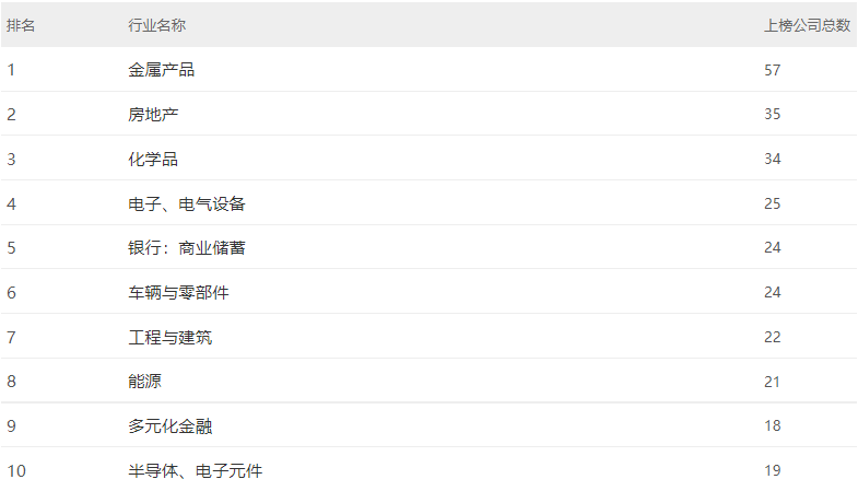 據上圖所示,根據上榜公司總數排名,工程與建筑行業公司總數為22,位列第七。