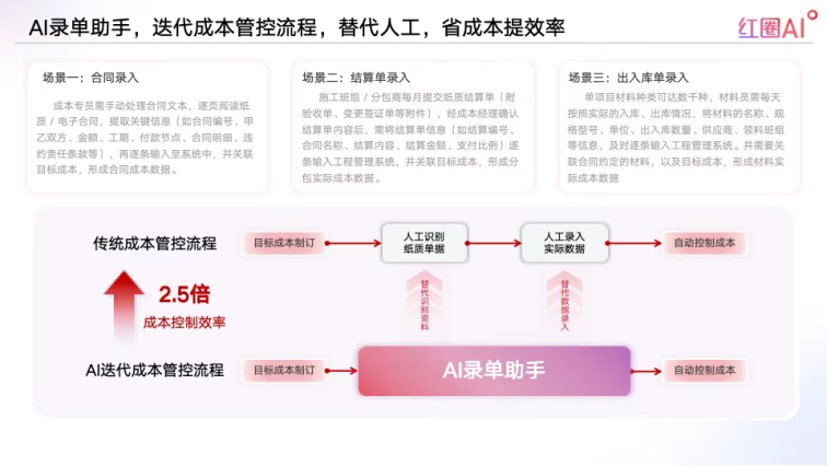 如果說數據和知識是 “智慧工程大腦” 的基礎,那么 AI 就是 “大腦的中樞神經”—— 紅圈系統將 AI 深度融入工程場景,讓智能不再是 “噱頭”,而是實實在在提升效率、優化決策的工具。