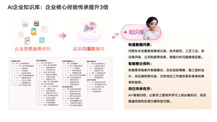 新員工遇到 “軟土地基怎么處理”“工期延誤如何協調” 這類問題,不用再到處找老師傅請教 —— 只需在知識庫中輸入問題,3 秒內就能獲得經過驗證的解決方案。這個知識庫整合了企業的技術規范、優秀施工方案、事故案例等所有核心資料,形成了一個 “統一的知識中樞”。它把傳統 “師帶徒” 的模式,升級成了可規模復制的數字化賦能平臺,新人培養效率大幅提升,完美解決了 “核心技術依賴專家” 的困境。