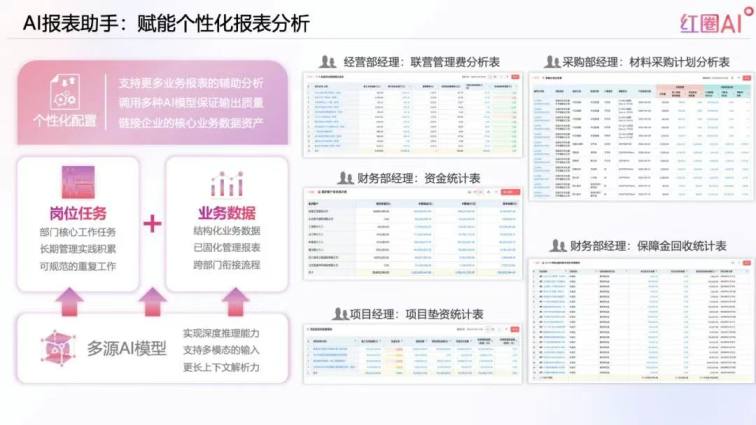 過去,財務、經營、項目等部門要花幾天時間做報表,結果還只是 “數據的堆砌”;現在,AI 報表助手能自動生成多維度管理報表,比如材料采購計劃分析、項目墊資統計、聯營管理費分析等,還能自定義配置報表維度,滿足不同崗位的需求。更進階的是 “項目 360°AI 解讀”:系統會綜合項目的進度、成本、質量、安全數據,自動對比目標與實際的差異 —— 比如發現某項目成本超支,會精準定位是 “材料價格上漲” 還是 “用量超標”;還能預警潛在風險,比如 “某項目進度滯后可能影響現金流”,并給出調整建議。