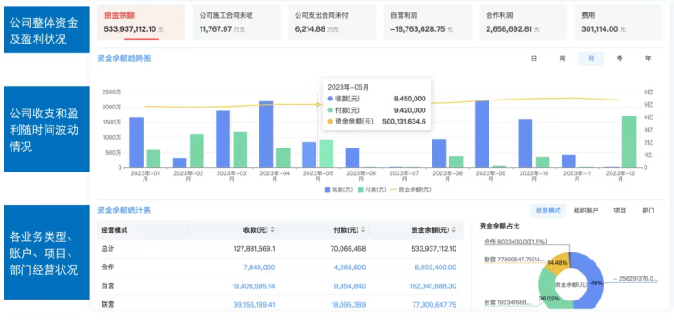 “管資本”的第一步,是得看清資本花在哪、賺在哪。紅圈先給所有項目建了一套“統(tǒng)一數(shù)據(jù)標準”——不管是項目現(xiàn)場的施工日志、材料采購單,還是分公司的資金流水、合同臺賬,所有數(shù)據(jù)都從“源頭”在線生成,實時同步到集團云端,中間沒有任何人工“加工”環(huán)節(jié)。這意味著什么?你在總部辦公室,打開系統(tǒng)就能像“做CT”一樣,直接“穿透”到任何一個項目的任何一張單據(jù):想查某項目的鋼筋采購成本,能看到每一筆采購的供應(yīng)商、單價、付款時間;想知道某項目的資金余額,能實時看到賬戶流水,連一筆小額報銷都不會漏;想盯進度,能看到現(xiàn)場每天上傳的施工照片、進度填報,是不是真的“達標”,一眼就懂。數(shù)據(jù)不再是“二手貨”,資本效益的真實情況,清清楚楚、明明白白。總部既能看全局——所有項目的整體盈利、資金總盤子,也能抓細節(jié)——單個項目的成本超支、資金滯后,“管資本”終于有了精準的“依據(jù)”。