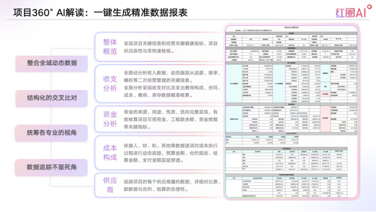 比如項目360°AI解讀,你想了解某個項目的情況,不用再讓下屬寫報告——點一下按鈕,系統(tǒng)自動生成一份“效益體檢報告”:資金夠不夠用?成本有沒有超支?進度是不是滯后?甚至能告訴你“成本超支是因為某分包商頻繁變更合同”,連優(yōu)化建議都給出來。相當于給你配了個“智能參謀”,不用自己扒數(shù)據(jù),問題根因、解決方向全清楚。