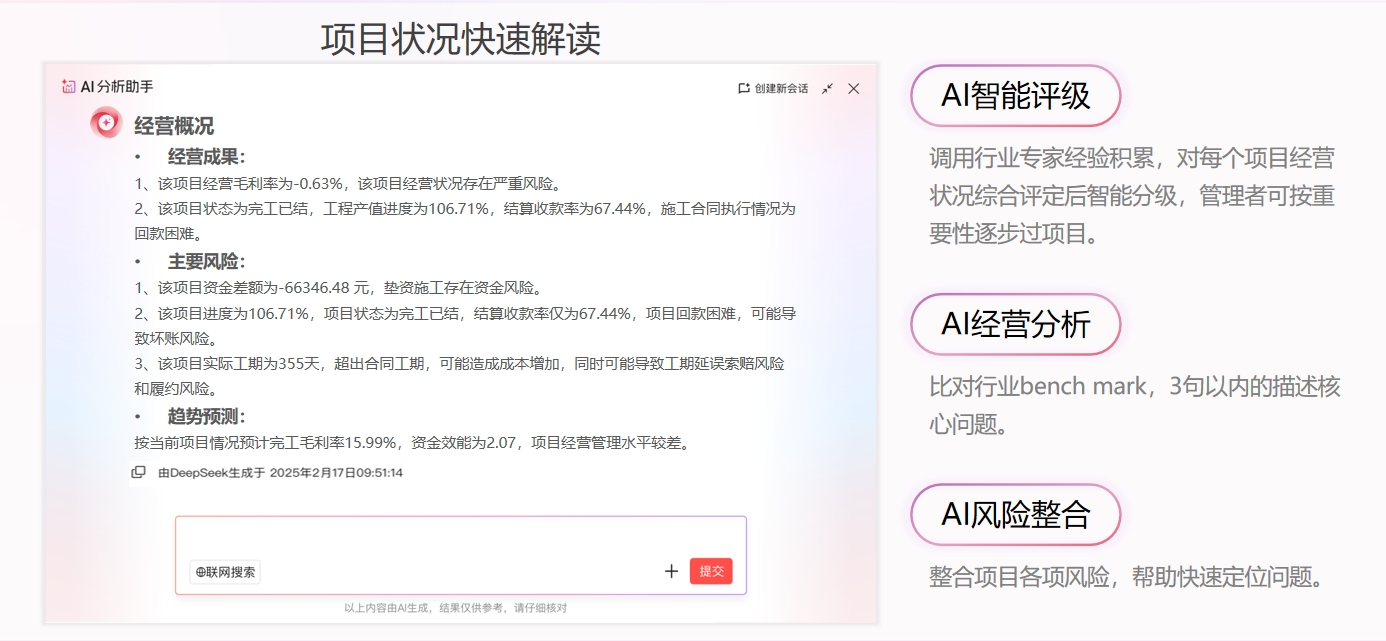紅圈推出的紅圈AI系列產品中的項目360°AI解讀,能把項目上的資金、成本、合同、付款這些數據全都整合在一起,一鍵生成一張項目全景作戰圖。