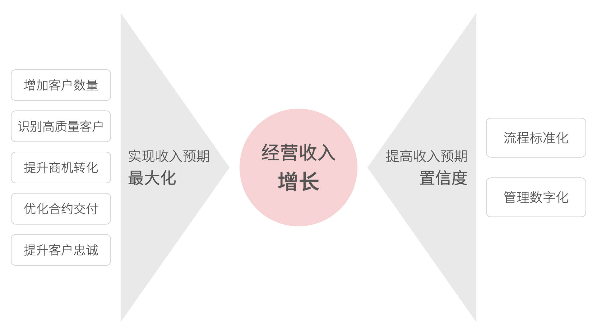 為了實(shí)現(xiàn)企業(yè)經(jīng)營(yíng)收入增長(zhǎng)這個(gè)核心目標(biāo),CRM 軟件需要企業(yè)實(shí)現(xiàn)收入預(yù)期最大化和提高收入預(yù)期置信度。實(shí)現(xiàn)收入預(yù)期最大化這個(gè)目標(biāo)可以從五個(gè)方面入手:增加客戶數(shù)量、識(shí)別高質(zhì)量客戶、提升商機(jī)轉(zhuǎn)化、優(yōu)化合約交付、提升客戶忠誠(chéng)。而提高收入預(yù)期置信度的本質(zhì)是降低業(yè)務(wù)戰(zhàn)略執(zhí)行的不確定因素,從人治模式轉(zhuǎn)型為系統(tǒng)管理,即流程標(biāo)準(zhǔn)化和管理數(shù)字化。
